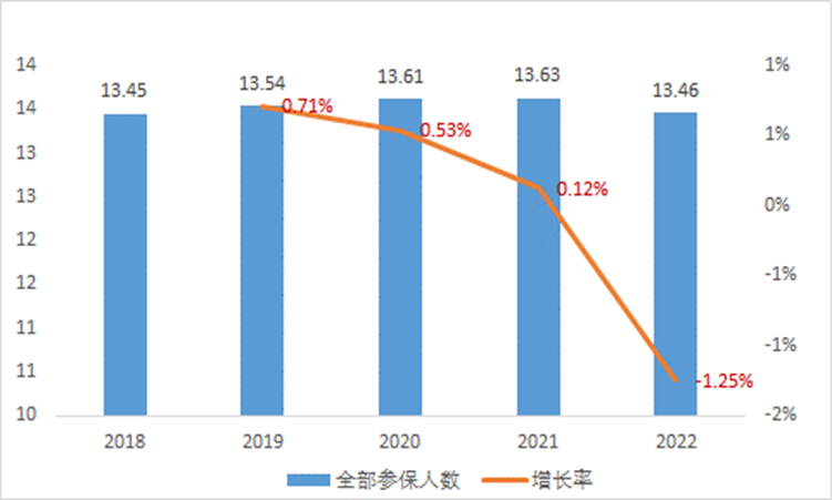 截至2022年底,基本医疗保险参保人数约13.46亿人,与去年同期相比下降1.25%。
