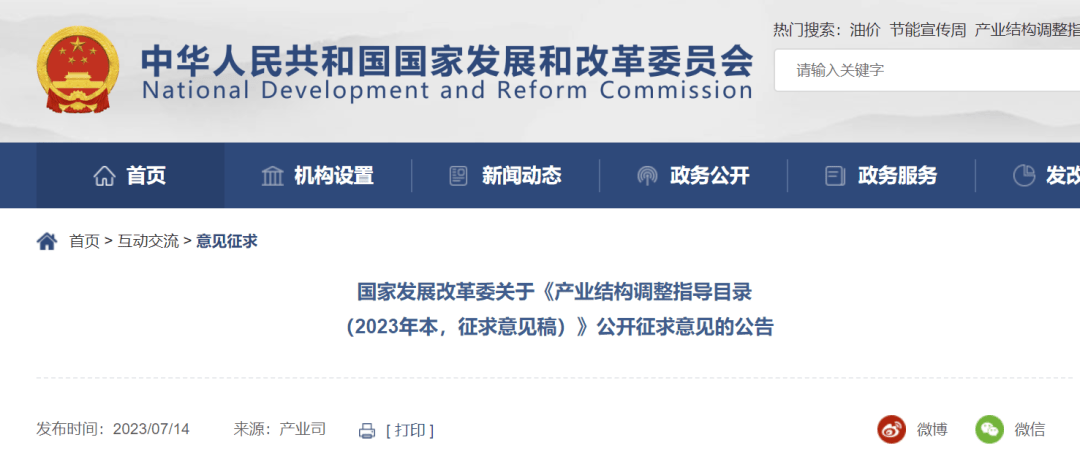 此次征求意见的时间为2023年7月14日至2023年8月14日,欢迎社会各界人士登录国家发展改革委门户网站(http://www.ndrc.gov.cn)首页“意见征求”专栏,进入“《产业结构调整指导目录(2023年本,征求意见稿)》公开征求意见”栏目,提出宝贵意见建议。