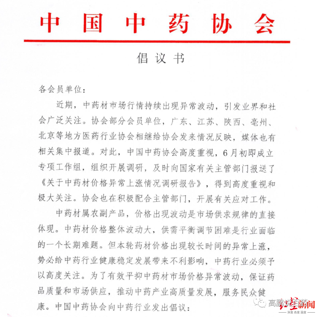 7月8日,中国中药协会再次向各单位发出倡议书,称近期中药材市场行情持续出现异常波动