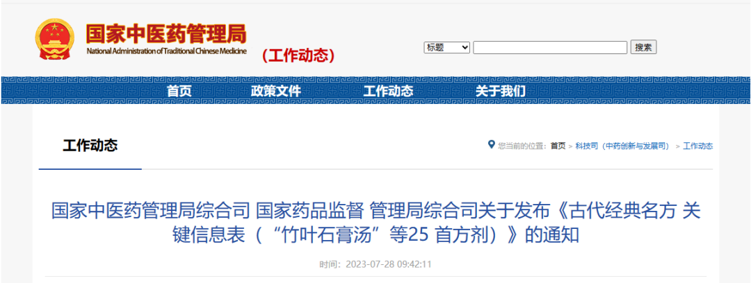 关于国家中医药管理局综合司 国家药品监督 管理局综合司发布《古代经典名方 关键信息表(“竹叶石膏汤”等25 首方剂)》的通知