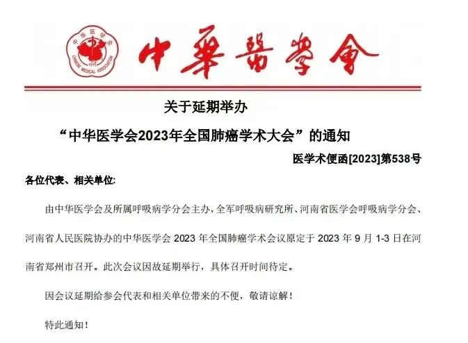 8月4日,原定于9月1日~3日在河南郑州召开的中华医学会2023年全国肺癌学术会议,宣布因故延期举行,具体召开时间待定。