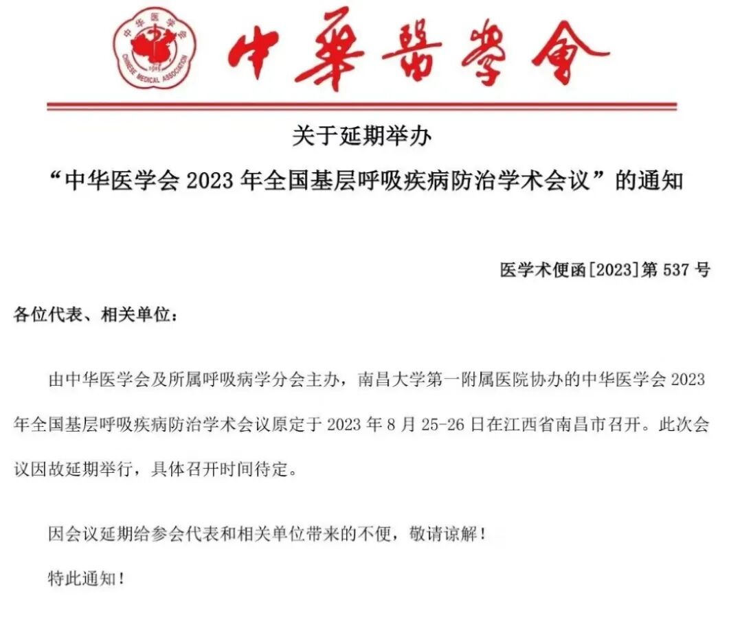 8月4日,原定于8月25日~26日在江西南昌召开的中华医学会2023年全国基层呼吸疾病防治学术会议,宣布因故延期举行,具体召开时间待定。