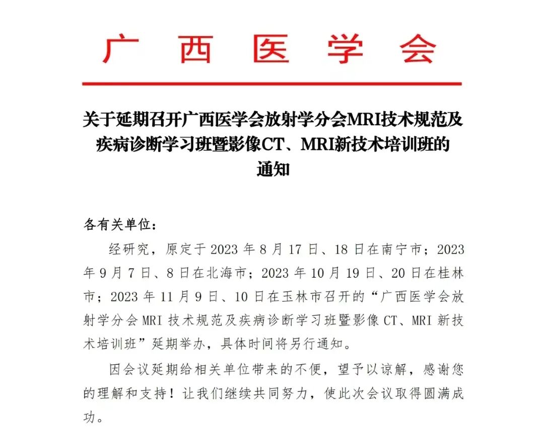 例如8月4日,广西医学会发布通知,广西医学会放射学分会MRI技术规范及疾病诊断学习班暨影像CT、MRI新技术培训班将延期举办,具体时间另行通知;8月3日,原定于8月6日在山西太原进行的太原市医学会病理专业委员会第十届病理学术会议暨中华医学会病理分会胸部学组肿瘤病理诊断学习班,受客观因素影响宣布延期举办。
