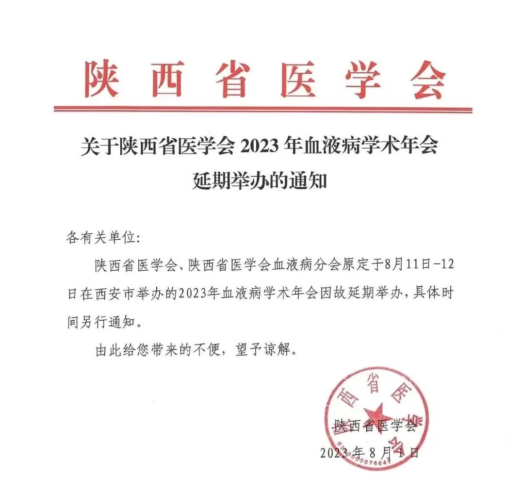 8月1日,陕西省医学会、陕西省医学会血液病分会原定于8月11日~12日在陕西西安市举办的2023年血液病学术年会因故延期举办,具体时间另行通知。