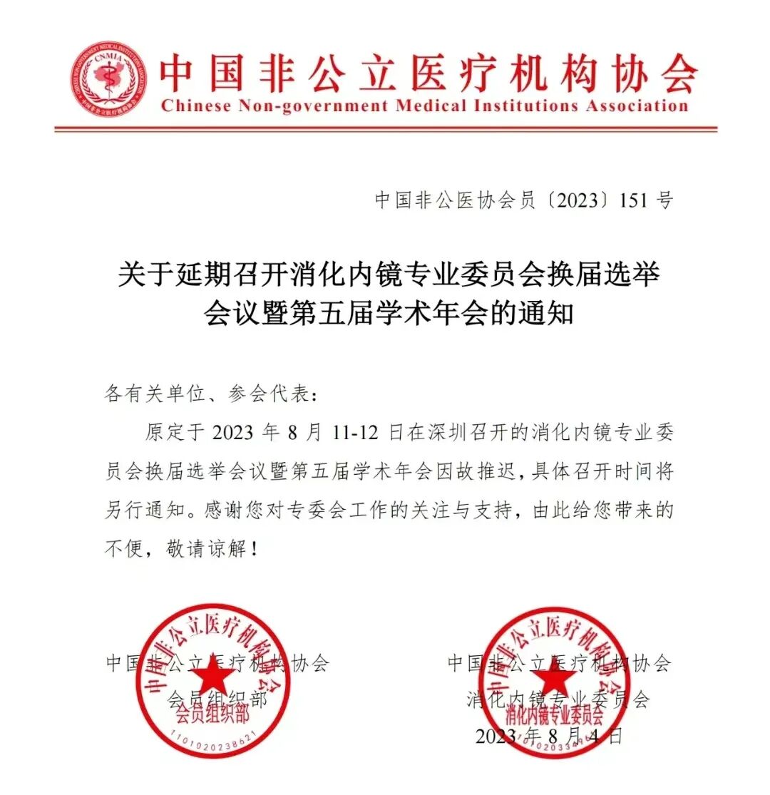 8月4日,原定于8月11日~12日在广东深圳召开的中国非公立医疗机构协会消化内镜专业委员会换届选举会议暨第五届学术年会,宣布因故推迟,具体召开时间将另行通知。