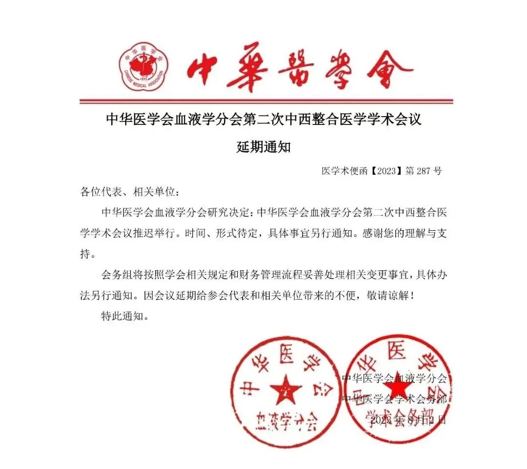 8月2日,中华医学会血液学分会第二次中西整合医学学术会议宣布推迟举行,时间、形式待定,具体事宜另行通知。