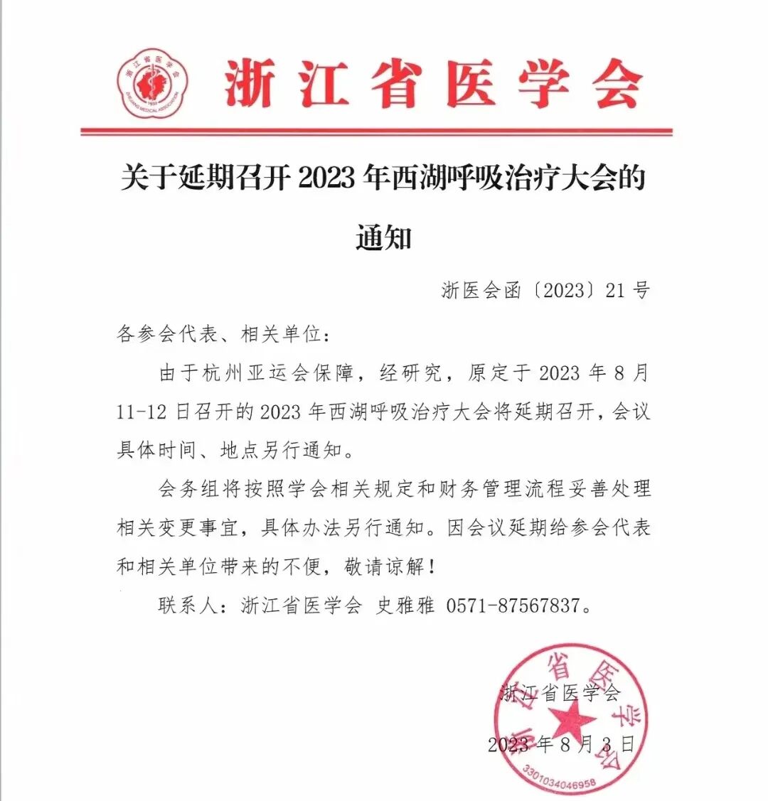 8月3日,原定于8月11日~12日在浙江杭州召开的2023年西湖呼吸治疗大会因杭州亚运会保障延期召开,会议具体时间、地点另行通知。