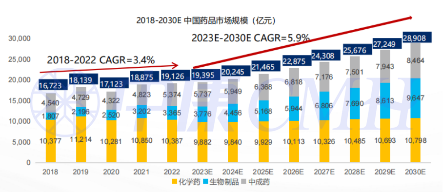 趋势二:中国药品市场规模持续扩大,增长速度预计到2030年规模达2.89万亿元。中国市场预计占全球市场的1/6,且增速或略高于全球市场规模增速。