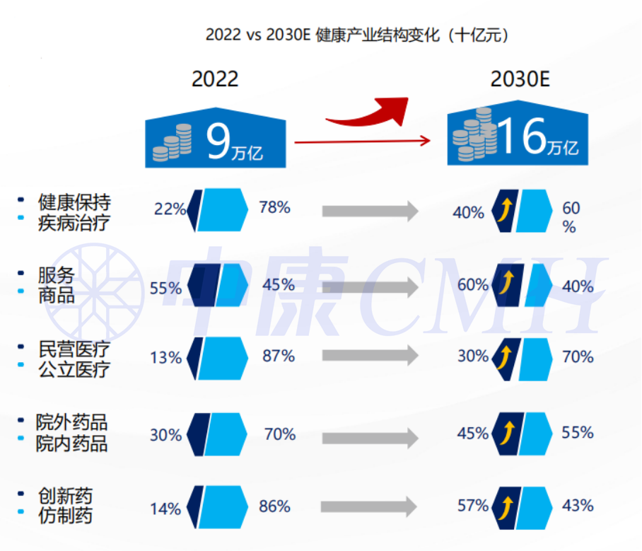 趋势一:2030年健康产业或达16万亿,产业结构发生变化。根据中康CMH预计,中国健康产业规模扩大的同时,结构发生明显变化,非疾病治疗类市场扩大到40%;单纯商品交易市场下降到40%左右;在消费型医疗的带动下,民营医疗快速崛起,市场份额扩大到30%;院外药品市场占比从30%扩大到45%;药品结构也发生明显的变化,创新药市场份额将超过50%。