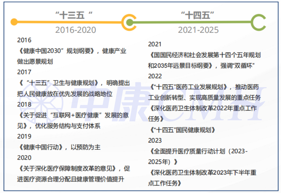 2016年《健康中国2030规划纲要》将建设“健康中国”上升为国家战略;2019年《健康中国行动》明确以预防为主;2020年《关于深化医疗保障制度改革的意见》发布;2022年《“十四五”医药工业发展规划》、《深化医药卫生体制改革2022年重点工作任务》、《“十四五”国民健康规划》;2023年《全面提升医疗质量行动计划(2023-2025年)》。