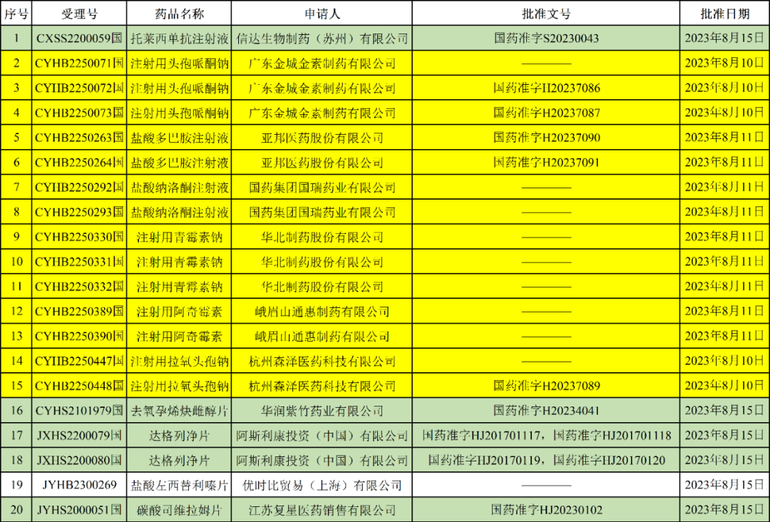 刚刚,国家药监局发布2023年08月17日药品批准证明文件送达信息,本批次共有20个受理号获批,其中14个为一致性评价受理号,过评品种包括: