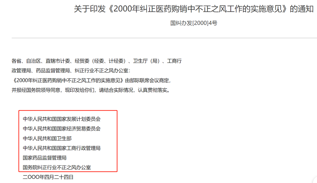 目前,国家药监局官网能搜到的最早医药反腐文件是当时6部门共同发布的《 2000年纠正医药购销中不正之风工作的实施意见》,其中提到,清理整顿药品市场价格,进一步降低企业自主定价药品的“虚高”价格和部分政府定价药品的过高价格。