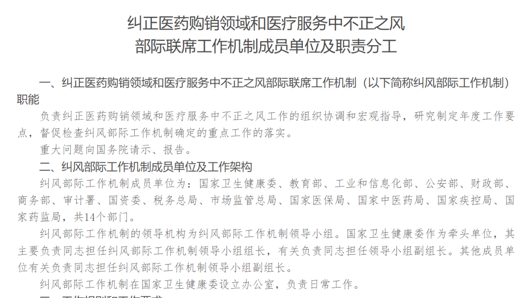 从2023年这场反腐风暴来看,参与医药反腐的部门不断增加。5月10日,国家卫健委官网发布的《关于调整纠正医药购销领域和医疗服务中不正之风部际联席工作机制成员单位及职责分工的通知》解读提到,《通知》的重点是对纠风部际工作机制成员单位进行了调整,由原来的9个增加到14个部门,国家卫生健康委为牵头单位,成员单位包括教育部、工业和信息化部、公安部、财政部、商务部、审计署、国资委、税务总局、市场监管总局、国家医保局、国家中医药局、国家疾控局、国家药监局。