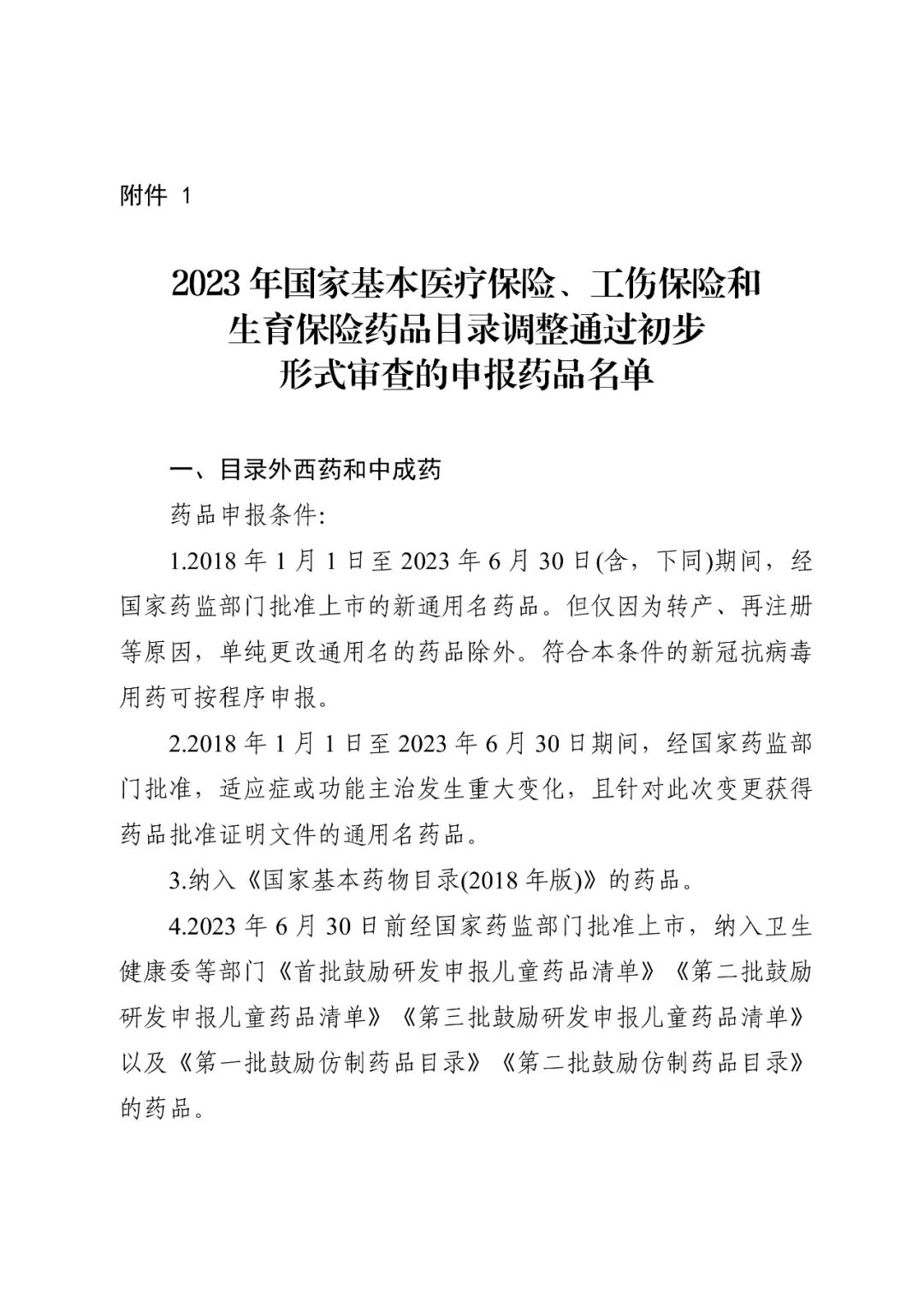 附件:1.2023年国家基本医疗保险、工伤保险和生育保险药品目录调整通过初步形式审查的申报药品名单