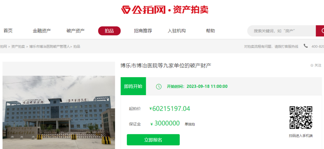 公告显示,接受拍卖的标的物为“博乐市博冶医院等九家单位的破产财产”,起拍价约2217万元,将于2023年9月18日开拍。
