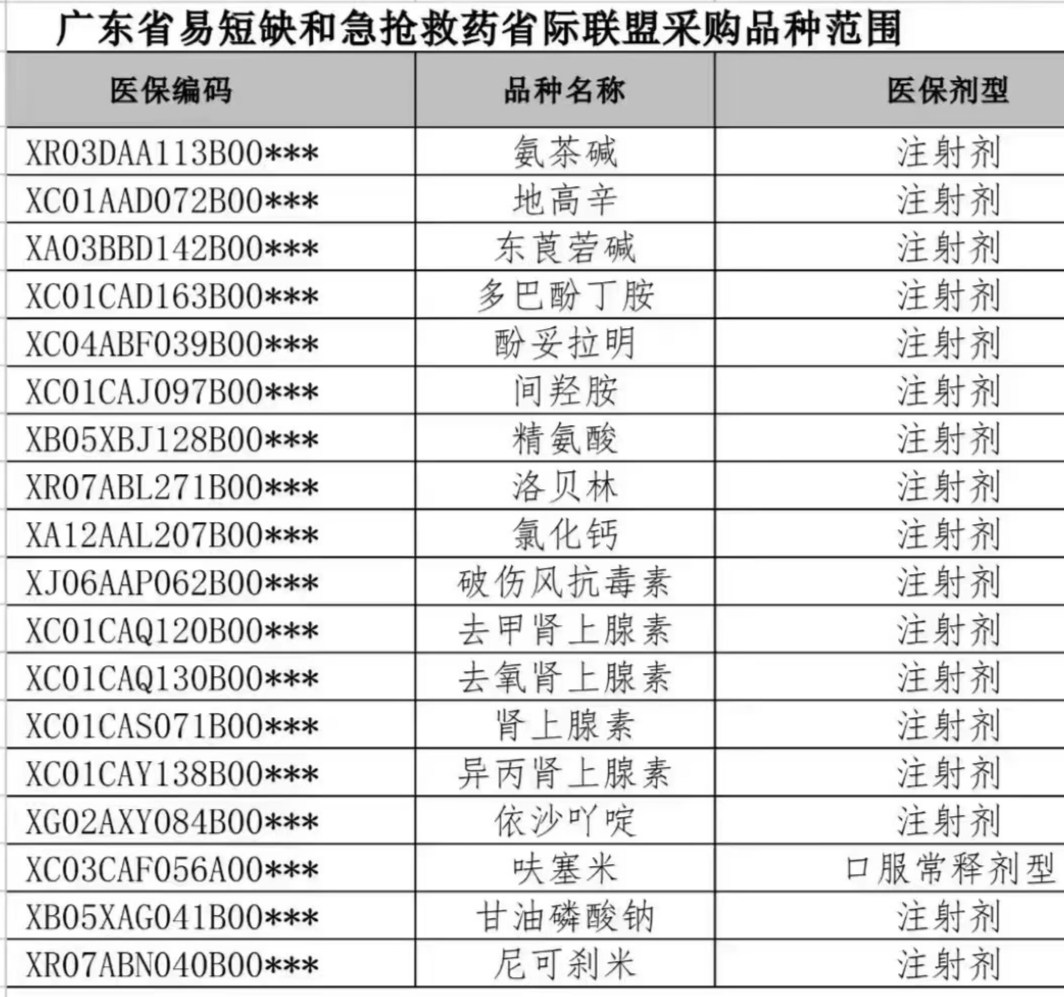 此次网传的广东省牵头的易短缺和急抢救药品省际联盟采购品种范围中,除了呋塞米、甘油磷酸钠、尼可刹米这三种外,均在6月收集信息的药品名单中。