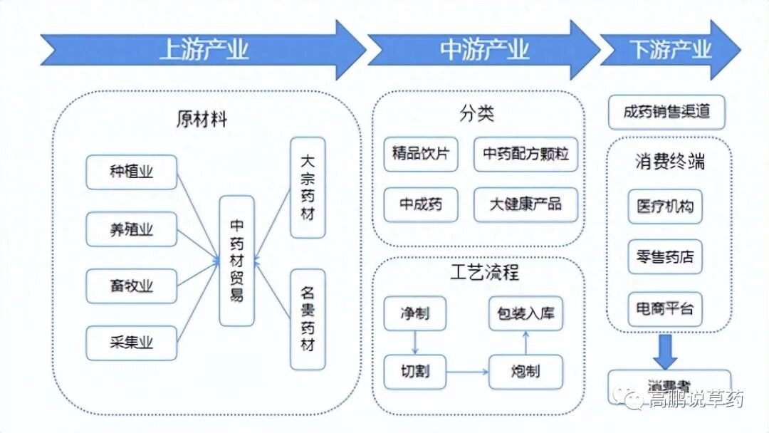改革开放后,随着市场经济的发展,中药行业的产业化进程也随之加速,如今已形成较为完备的上下游产业链。中药产业的上游是药材供应商;中游主要是中药企业,涉及中药饮片加工和中成药生产等;下游是销售环节,中药产品经流通运输至医疗机构和药店,最终到达消费者手中。