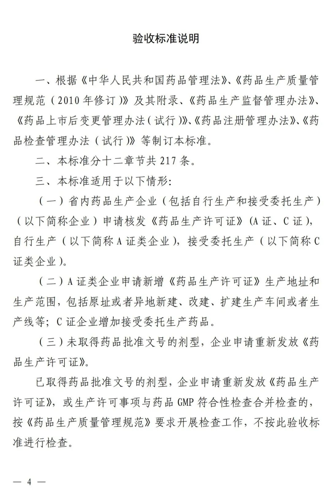 已取得药品批准文号的剂型,企业申请重新发放《药品生产许可证》,或生产许可事项与药品GMP符合性检查合并检查的,按《药品生产质量管理规范》要求开展检查工作,不按此验收标准进行检查。