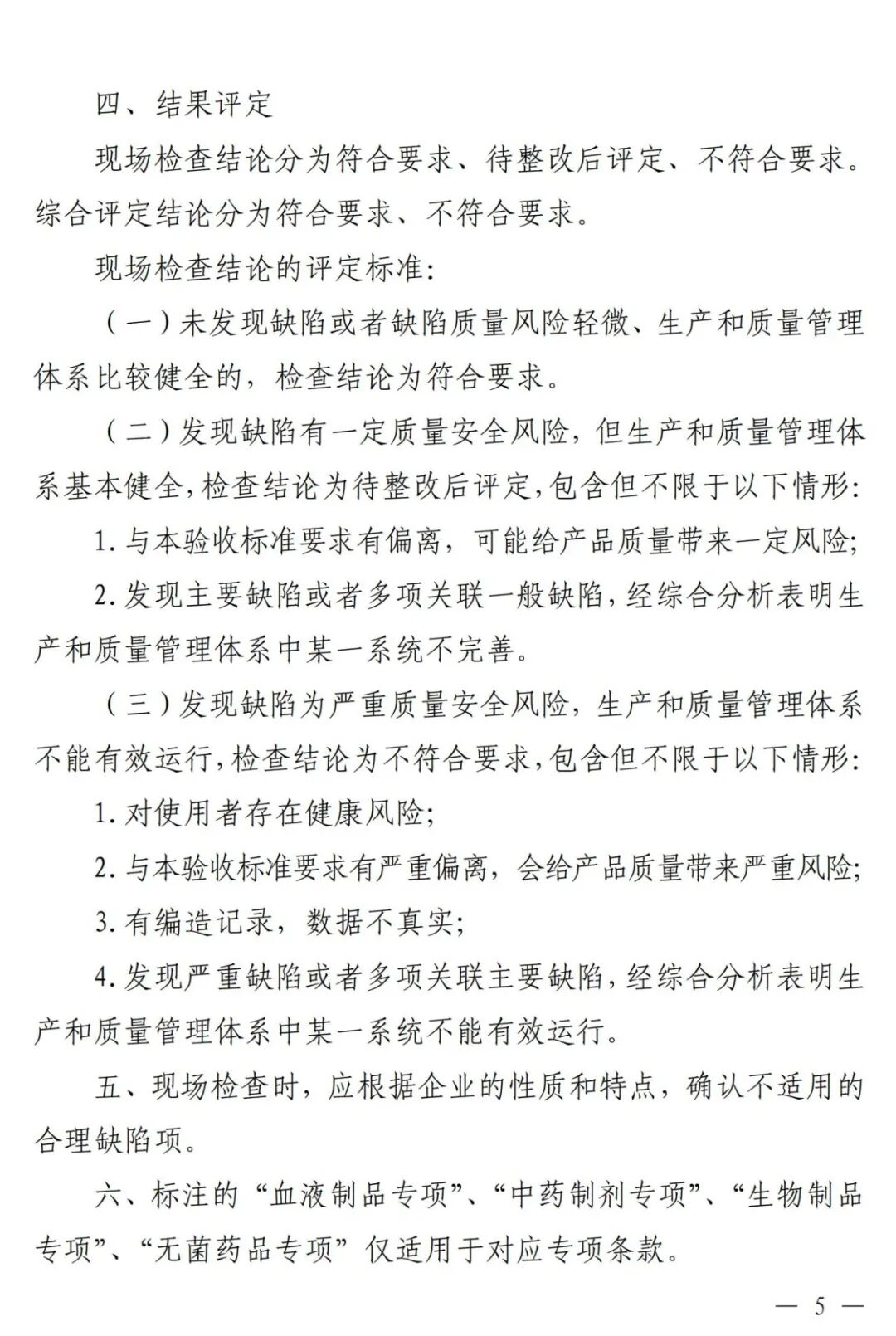 4、明确了现场检查结论分为符合要求、待整改后评定、不符合要求。综合评定结论分为符合要求、不符合要求。