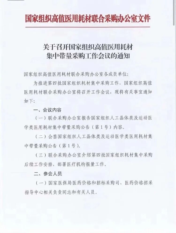 据科创板日报消息,国家组织高值医用耗材联合采购办公室(“联采办”)7日下发文件,通知各成员单位召开会议,会议于9月12日召开,会议内容包括介绍第四批国家组织耗材集中带量采购后续工作安排,部署医疗机构报量等。据文件,第四批高值耗材国家集采品种涉及人工晶体和骨科运动医学类高值耗材。