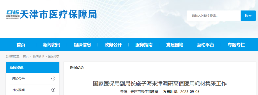 9月5日,天津市医保局公布了”国家医保局副局长施子海来津调研高值医用耗材集采工作“的消息。
