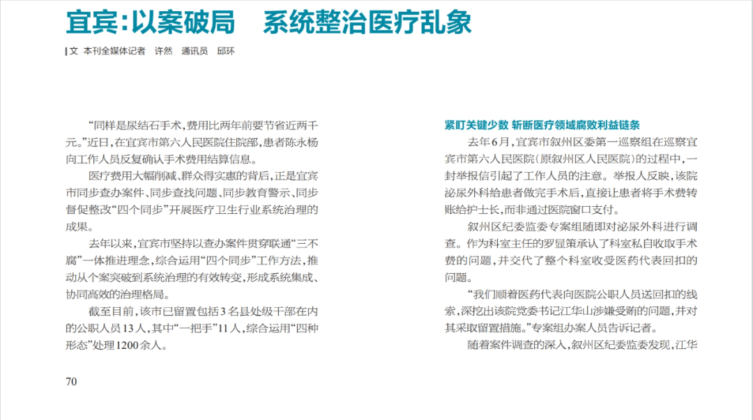 近日,廉政瞭望报道《宜宾:以案破局 系统整治医疗乱象》文章披露: