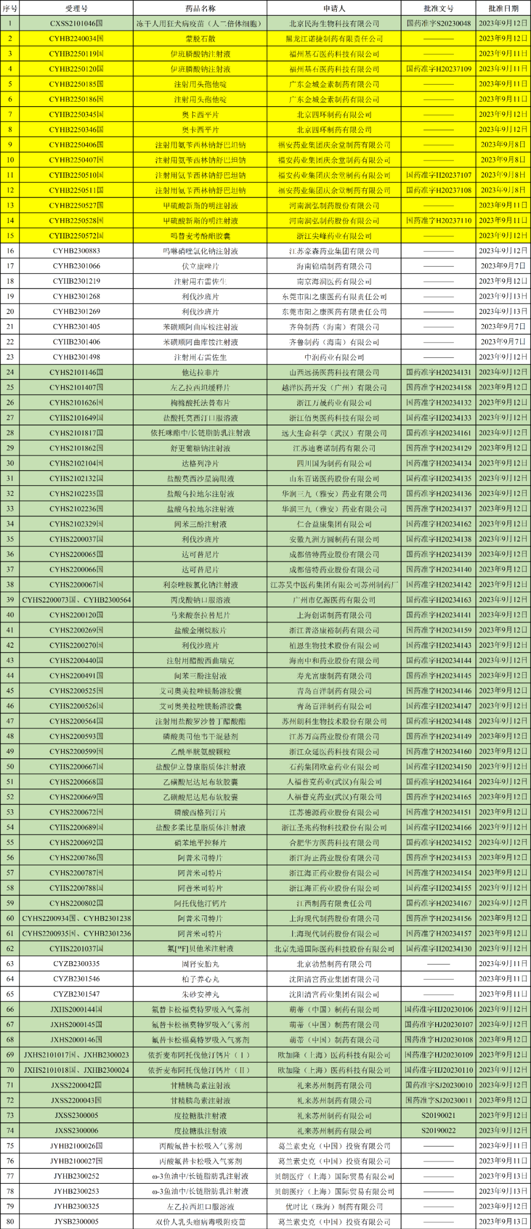 国家药监局发布2023年09月15日药品批准证明文件送达信息,本批次共有80个受理号获批,其中14个为一致性评价受理号(7个品种),包括: