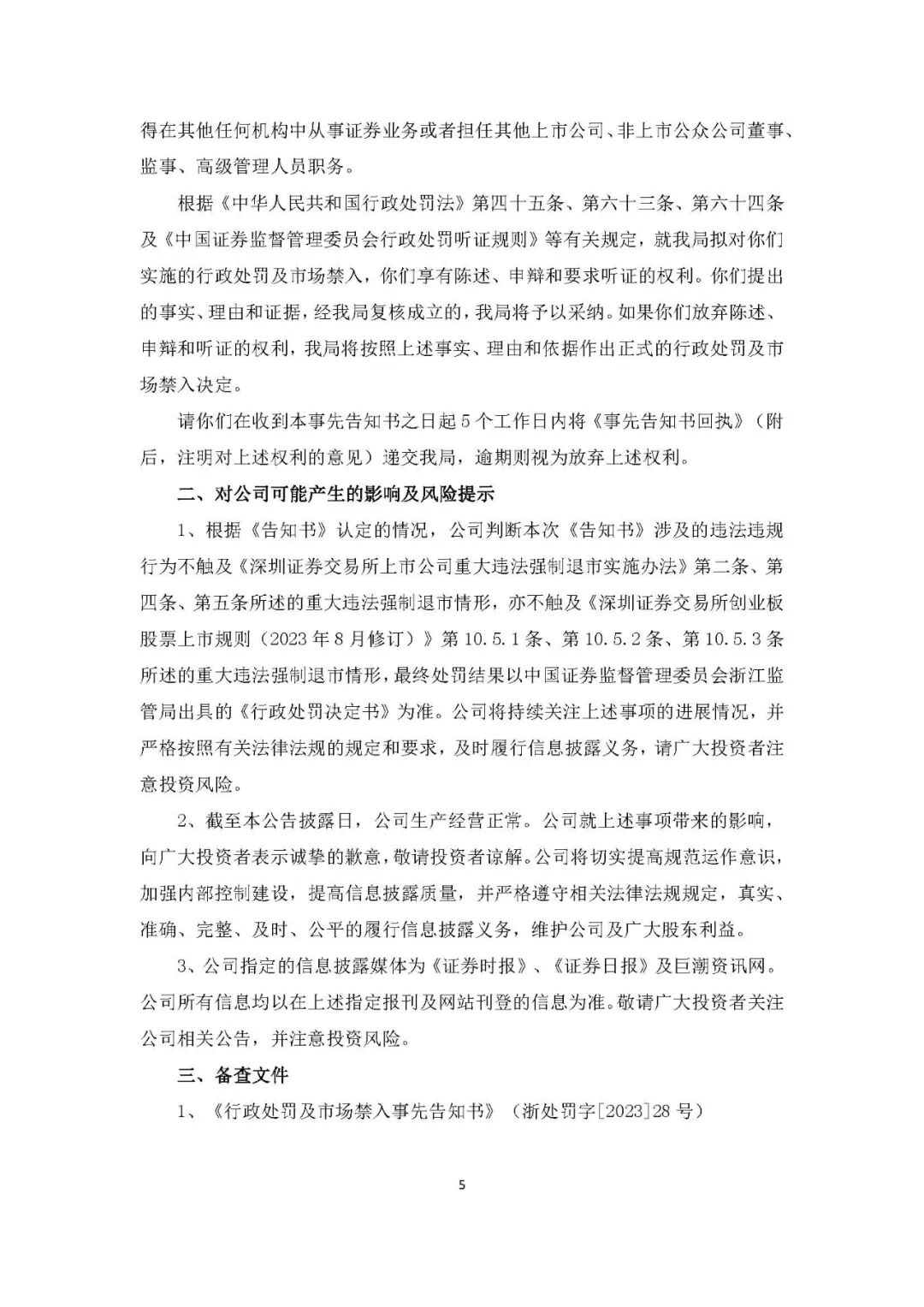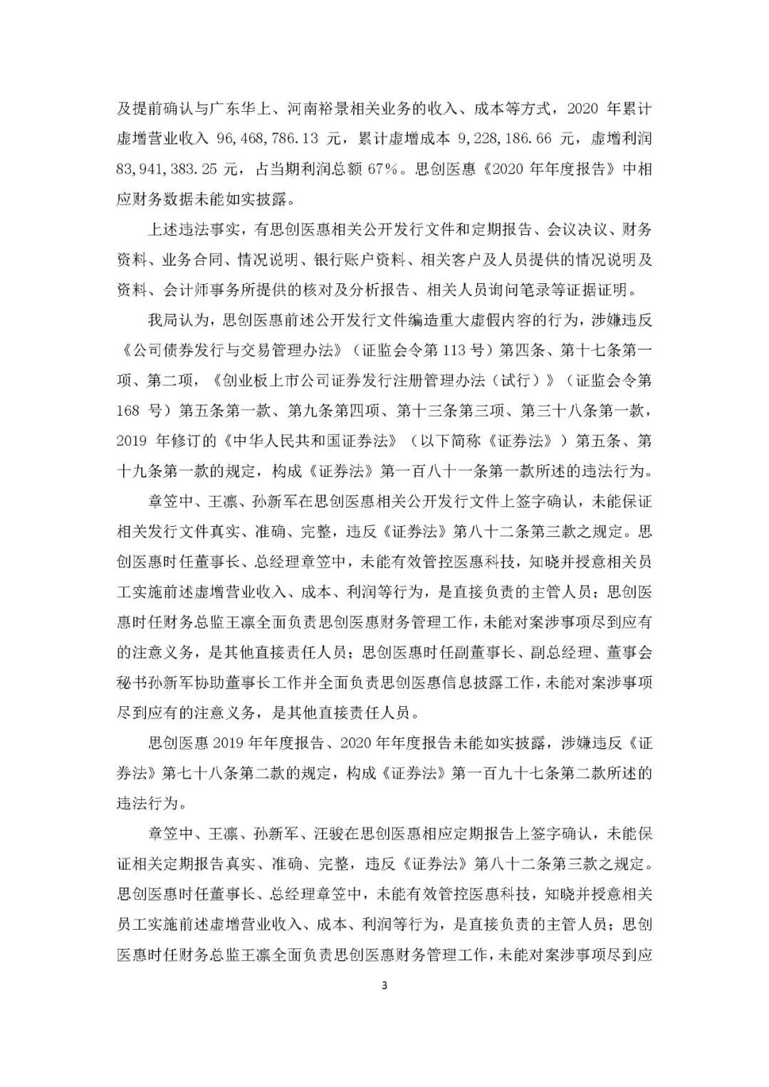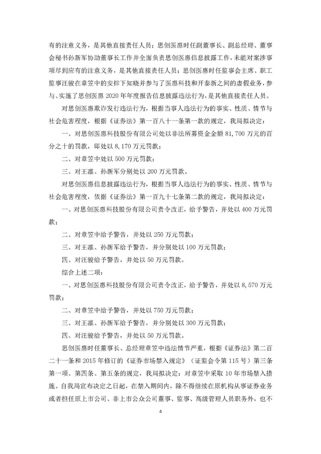 9月25日晚间,思创医惠公告,收到了浙江证监局下发的《行政处罚及市场禁入事先告知书》,因欺诈发行违法行为和信息披露违法行为,思创医惠被罚款8570万元,时任董事长、总经理章笠中被罚款750万元,并处以10年市场禁入,另有多名高管一同被罚。