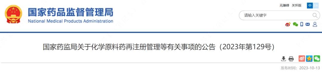 2023年10月13日,为进一步落实化学原料药管理的有关要求,国家药监局发布了关于化学原料药再注册管理等有关事项的公告(2023年第129号),对化学原料药再注册流程和时限给出了明确要求,本公告自发布之日起施行。