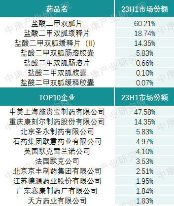 表1:23H1二甲双胍等级医院市场销售份额分布