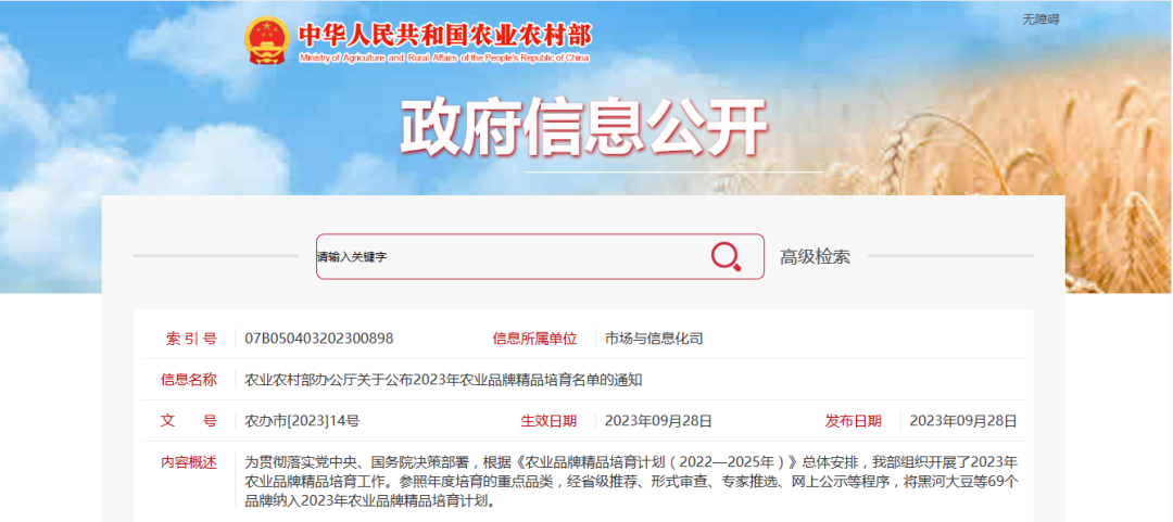 为贯彻落实党中央、国务院决策部署,根据《农业品牌精品培育计划(2022—2025年)》总体安排,我部组织开展了2023年农业品牌精品培育工作。参照年度培育的重点品类,经省级推荐、形式审查、专家推选、网上公示等程序,将黑河大豆等69个品牌纳入2023年农业品牌精品培育计划。