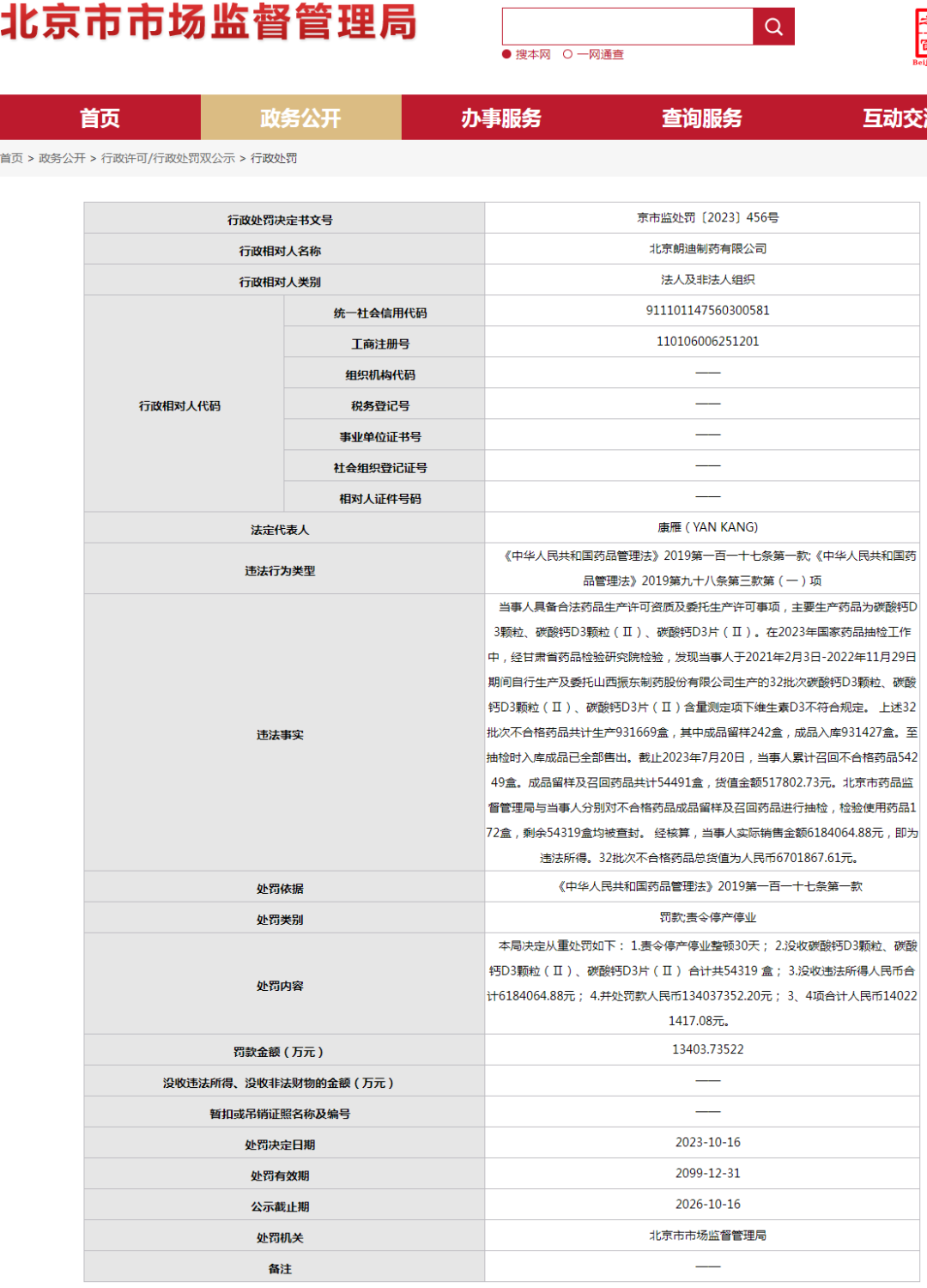 北京市市场监督管理局决定从重处罚如下:1.责令停产停业整顿30天;2.没收碳酸钙D3颗粒、碳酸钙D3颗粒(Ⅱ)、碳酸钙D3片(Ⅱ) 合计共54319 盒;3.没收违法所得人民币合计6184064.88元;4.并处罚款人民币134037352.20元;3、4项合计人民币140221417.08元。