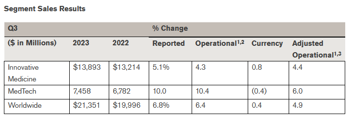 美国时间10月17日美股盘前,强生官网发布消息公布了一份调整后利润和营收均超预期的第三季度业绩。数据显示,2023财年第三季度报告销售额同比增长 6.8%,达到214亿美元,高于预期的210.4亿美元。净利润为43.1亿美元,每股收益 (EPS) 为 1.69 美元,增长 4.3%。财报公布后,强生盘前涨1.54%。但今年迄今为止,强生股价累计下跌近11%,市值约为3790亿美元。医疗设备与制药销售双双激增