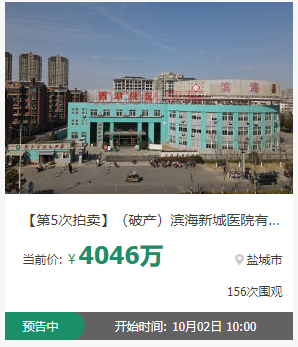 无独有偶,惠来东明医院的整体建筑物、经营场所所有医疗器材、设备等及周边土地,于10月5日开始竞拍,起拍价4775.42万元。惠来东明医院成立于2015年,位于广东省揭阳市,是按二级医院标准建设的现代化综合医疗机构。另外,在京东拍卖网上,滨海新城医院有限公司所属的房屋建筑物、土地使用权、机械设备及绿化树木等,于10月2日被竞拍,起拍价4046万元。