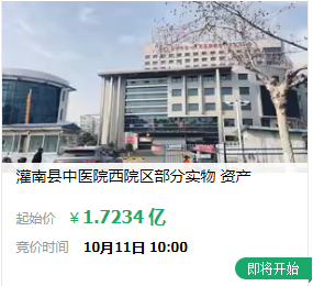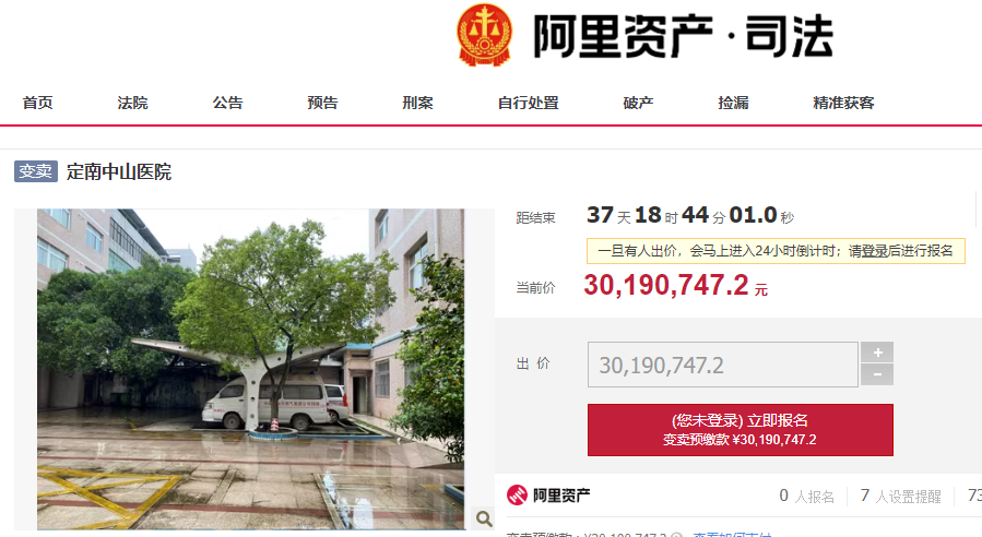 接受拍卖的医院为“灌南县中医院西院区”,起拍价17234.31万元。公告显示,此次拍卖的是灌南县中医院西院区部分实物资产,包括西院区所拥有的土地使用权、建筑物、诊疗设备、车辆及办公用品等。据了解,灌南县中医院是江苏连云港拥有40年历史的二级甲等中医院。医院始建于1978年12月,2003年8月改制为非营利性医疗机构。在传出拍卖消息前,该院还曾向相关单位提交注销申请。除了灌南县中医院,阿里拍卖网上还有多家医院正在或者即将被竞拍。02