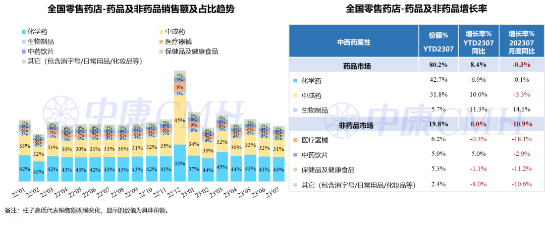 与此同时,7月份,药品、非药规模均呈现负增长。化药停滞增长(+0.1%),中成药规模下滑(-3.3%),仅生物制品保持双位数增长(+14.1%);而医疗器械、保健品及健康食品、消字号等产品规模更是下降超10%。