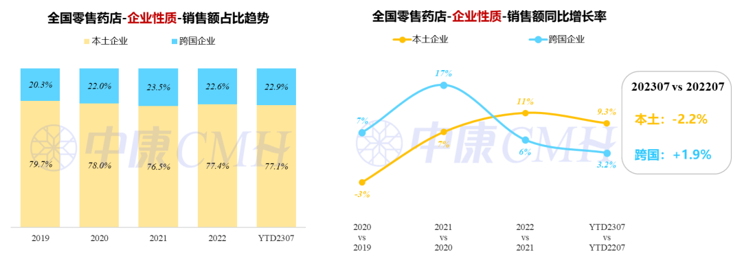 本土企业今年1-7月市场规模占比77.1%,销售额同比增长9.3%;跨国企业占比22.9%。7月份,本土企业销售额同比出现负增长(-2.2%),跨国企业实现增长1.9%。