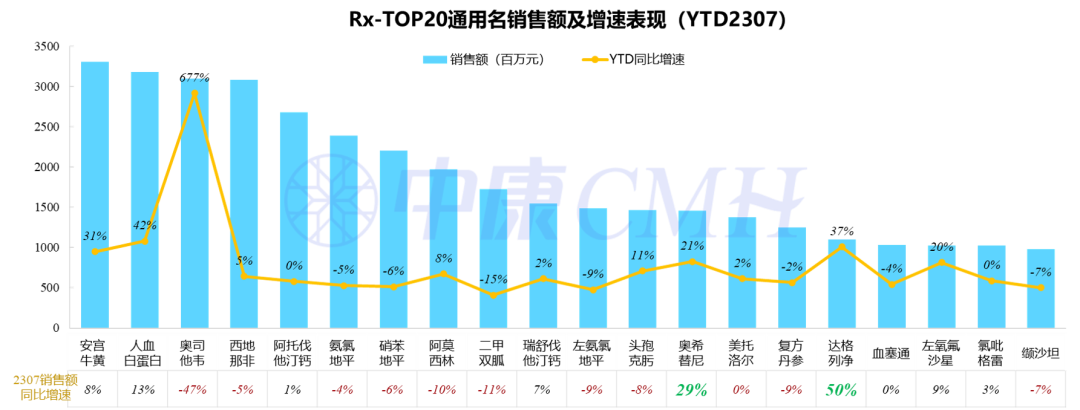 今年1-7月份零售药店处方药-TOP20品种:安宫牛黄、人血白蛋白、奥司他韦的销售规模位列处方药市场前三名;头部品种中,奥希替尼肿瘤药、达格列净降糖药增长亮眼。
