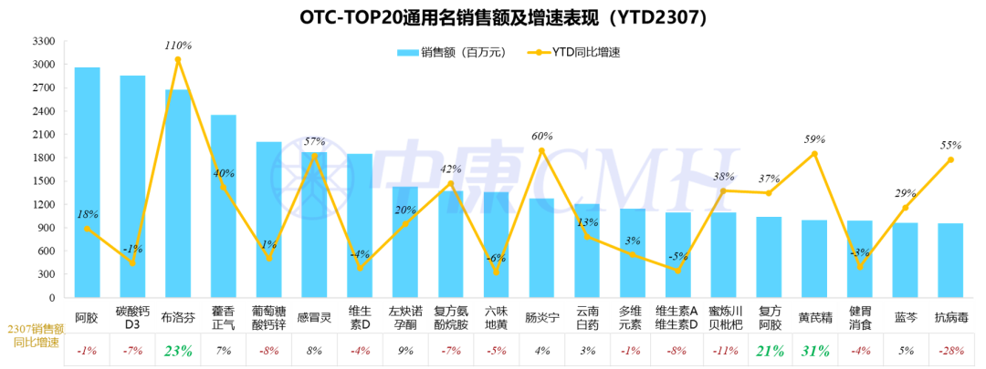 今年1-7月份零售药店非处方药TOP20:阿胶、碳酸钙D3、布洛芬销售额排名OTC市场前三名,其中布洛芬在7月份仍维持双位数增长;除布洛芬外,复方阿胶、黄芪精气血滋补品种增长相对突出。