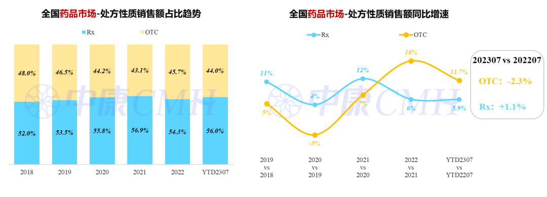 截至今年7月,2023年全国零售药店市场规模已达3,091亿元,同比上涨6.6%。7月份零售药店市场销售额总额为406亿元,同比下降2.5%。其中,值得注意的是,7月份OTC药品销售在今年首次出现下跌,为-2.3%;处方药销售额增速进一步放缓,同比增长1.3%。