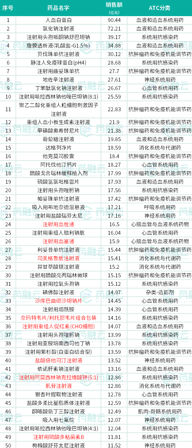 此外,辉瑞公司的奈玛特韦片/利托那韦片组合包装以及上海上药的注射用硫酸多粘菌素B等4家企业的独家品种也跻身于TOP50品种名单之中。