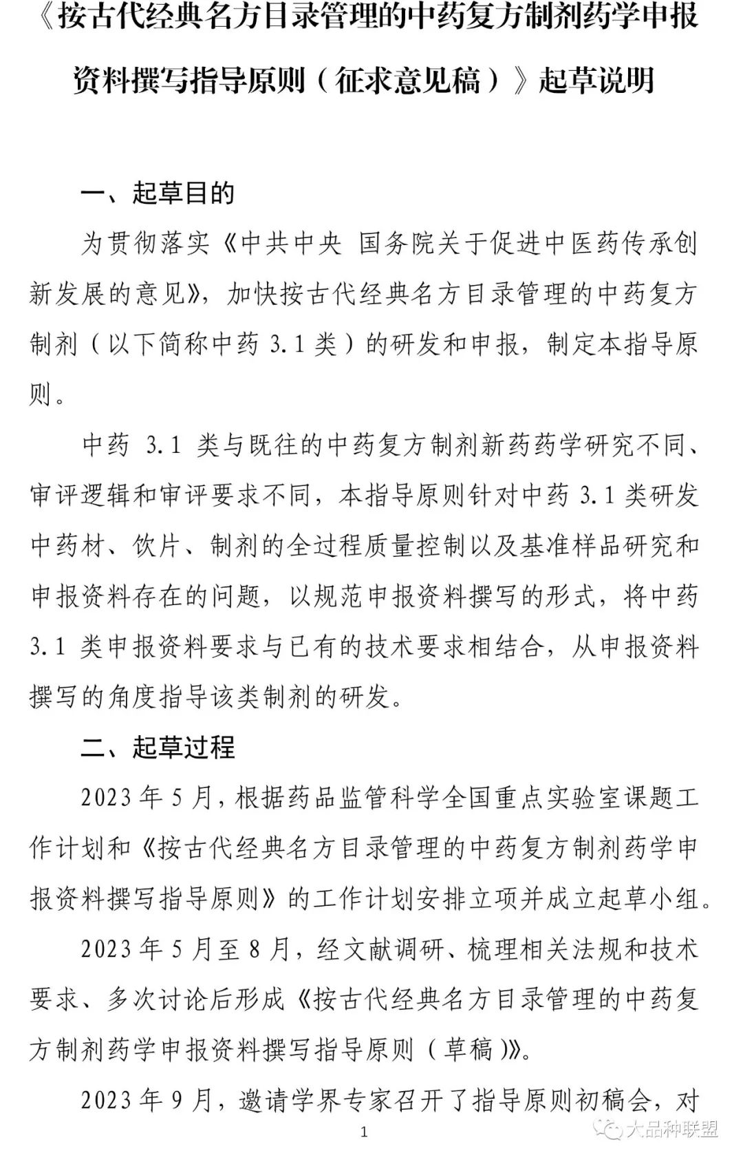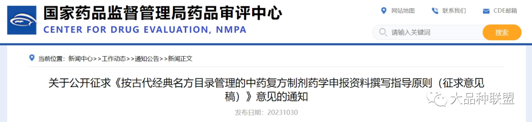 为贯彻落实《中共中央 国务院关于促进中医药传承创新发展的意见》,加快按古代经典名方目录管理的中药复方制剂的研发和申报,药审中心起草了《按古代经典名方目录管理的中药复方制剂药学申报资料撰写指导原则(征求意见稿)》。经征求中心内部相关专业以及专家意见,形成征求意见稿。现在中心网站予以公示,以广泛听取各界意见和建议。