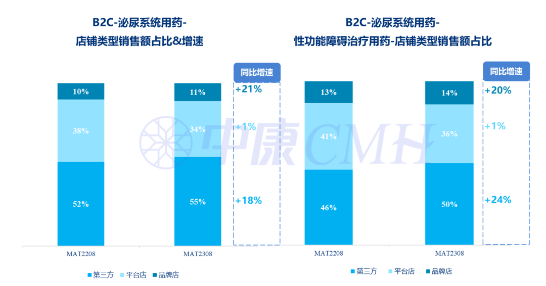 在门店分类中,第三方店铺在泌尿系统用药规模中贡献超5成市场;细分类性功能障碍治疗用药中,第三方店铺表现同样优于平台店和品牌店,同比增长24%。