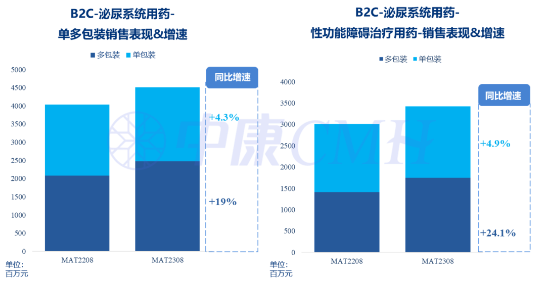 聚焦产品包装,泌尿系统用药在B2C渠道中多包装推动品类增长更显著,而细分类性功能障碍治疗用药多包装同比增速要优于单包装,达24.1%。