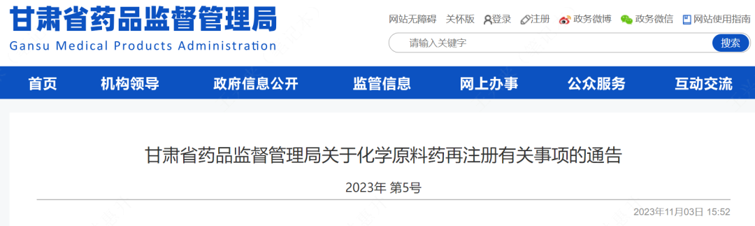 2023年11月02日,为进一步做好甘肃省化学原料药再注册工作,甘肃药监局发布了关于化学原料药再注册有关事项的通告,对甘肃省内原料药申报流程、受理部门、注意事项等进行了说明。
