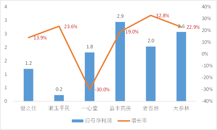 六大连锁药店三季度归母净利润及增长情况(单位:亿元)