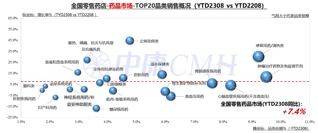 感冒清热、解热镇痛、止咳祛痰药规模增长领先药品整体。此外,零售药店在肿瘤药、滋补保健类、皮肤用药、血液造血系统用药上规模双位数增长,糖尿病、高血压品类销售下滑。