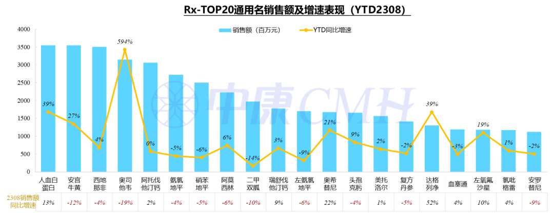 处方药-TOP20:在今年1-8月份,人血白蛋白、安宫牛黄、西地那非位列前三名;TOP20品种中,奥希替尼、达格列净今年截至8月份整体销售表现十分亮眼,维持双位数增长。