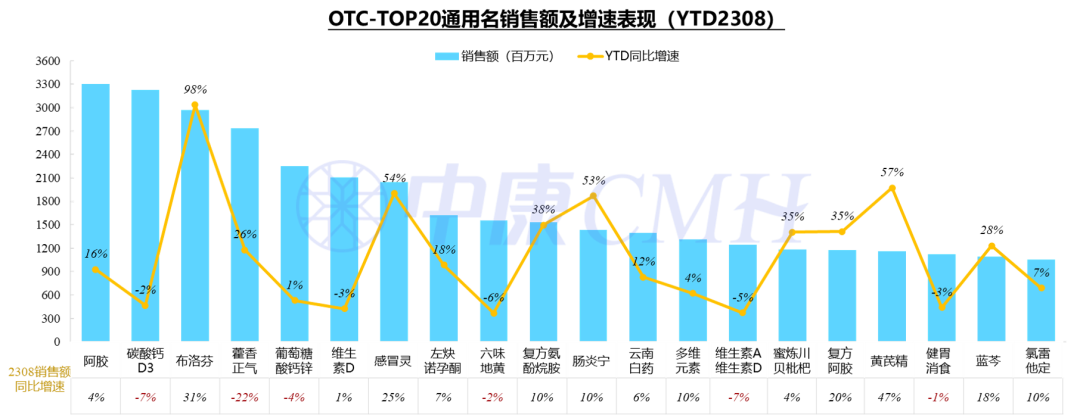 非处方药-TOP20:在今年1-8月份,阿胶、碳酸钙D3、布洛芬排名前三名;8月份布洛芬、感冒灵以及滋补品种复方阿胶、黄芪精销售额增长维持领先。