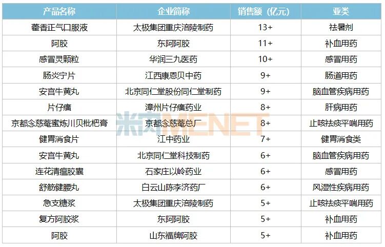 表1:2023上半年销售额超过5亿元的中成药品牌(按产品名+生产企业统计)